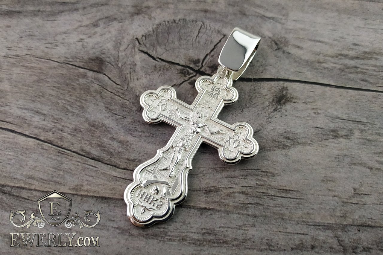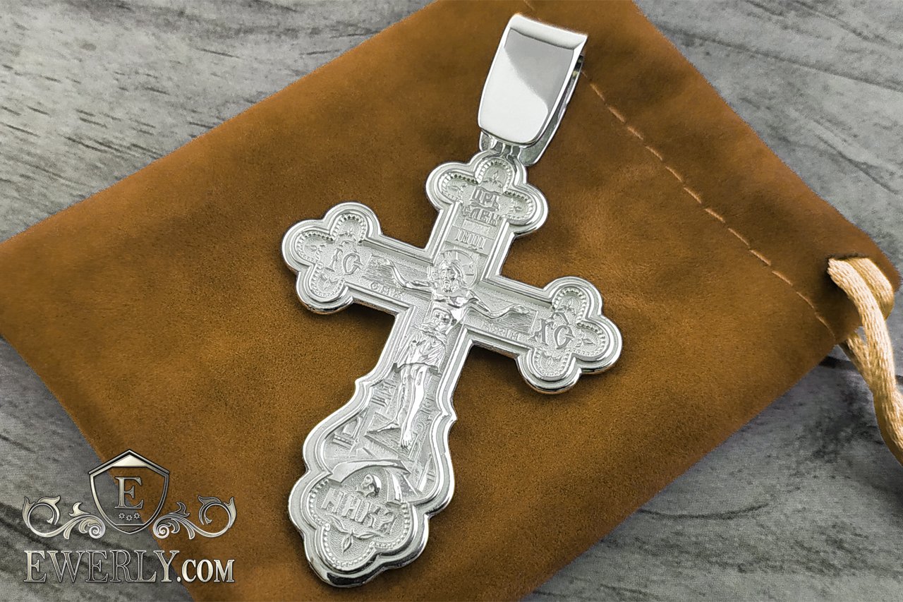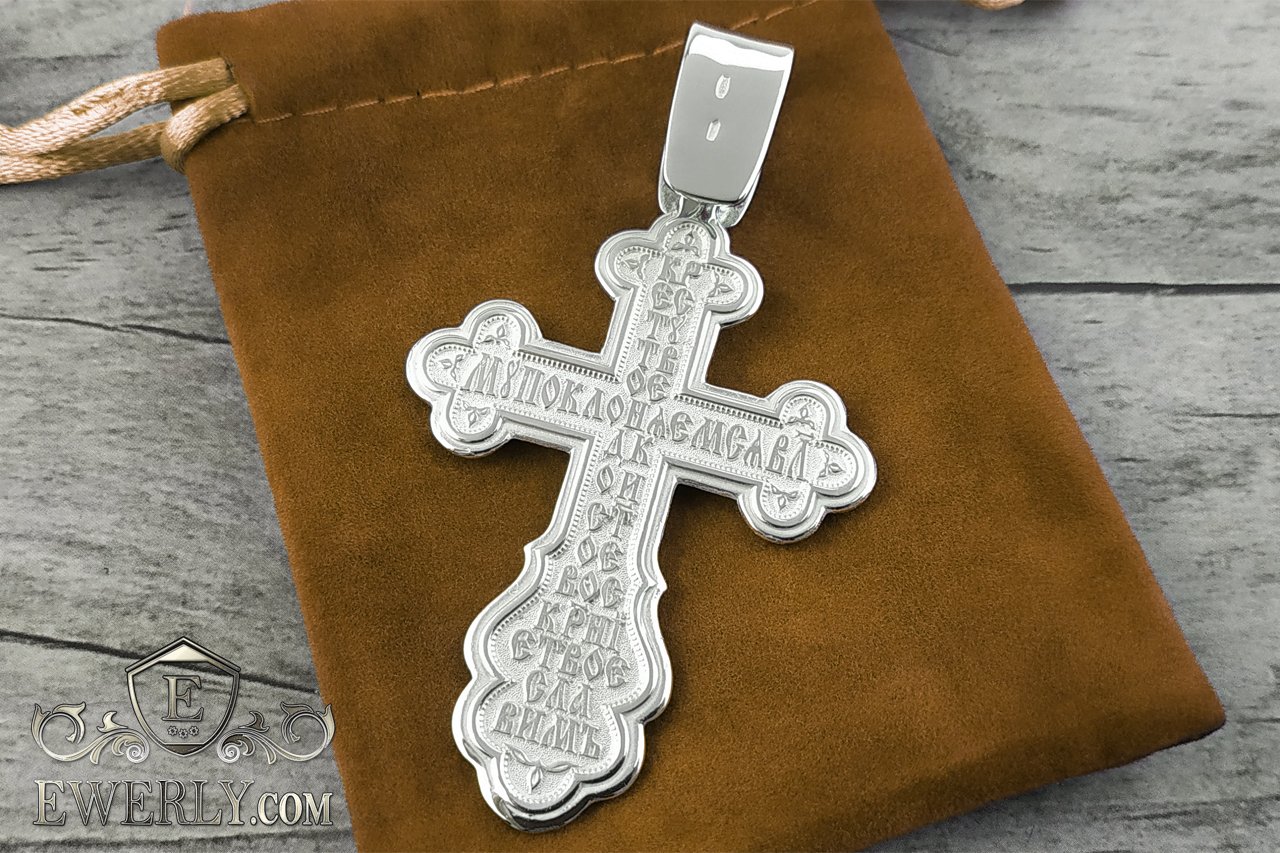 Изображено на фото: Православный серебряный крест с Распятием Христовым. Молитва Кресту. Длина: 5.7 см