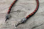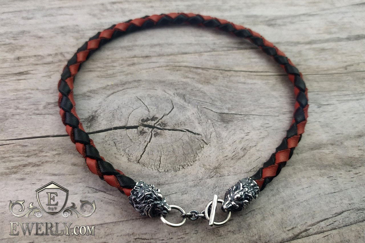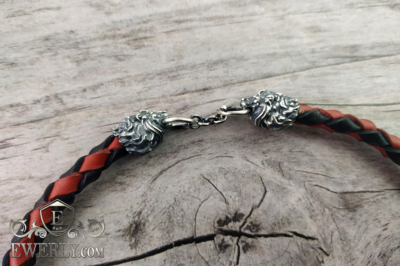 Мужской браслет - жгут из натуральной кожи с серебряным замком в виде двух голов львов.