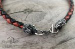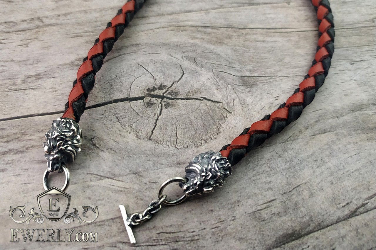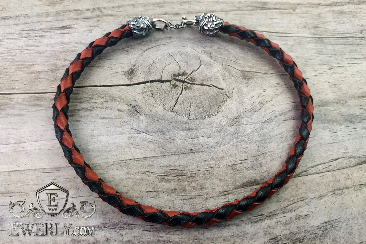 Мужской браслет-жгут из кожи с серебряным замком (головы львов)