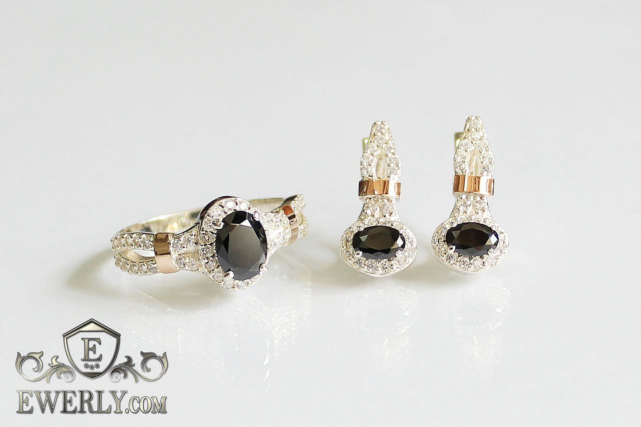 Серёжки и кольцо из серебра с золотом и чёрными камнями