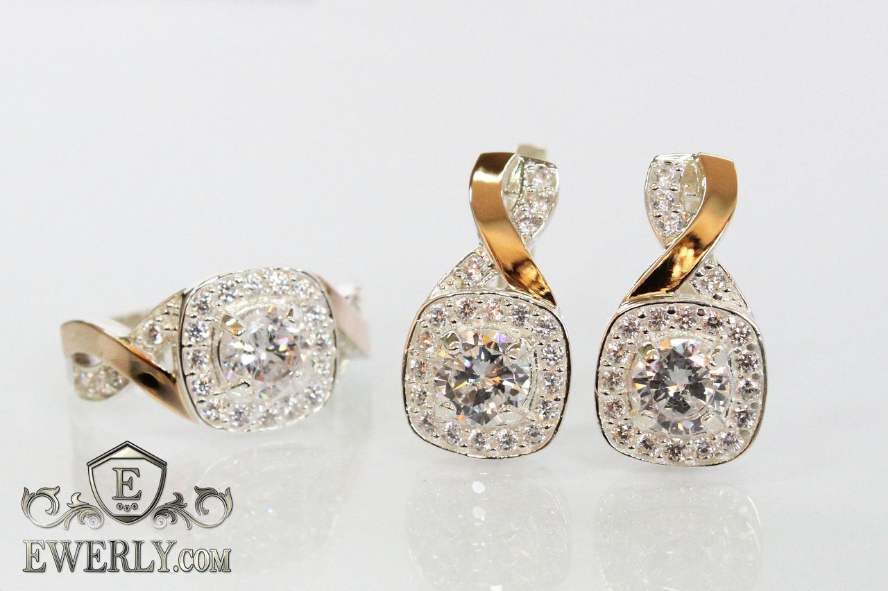 Серебряные серьги и кольцо с золотыми вставками и белыми камнями
