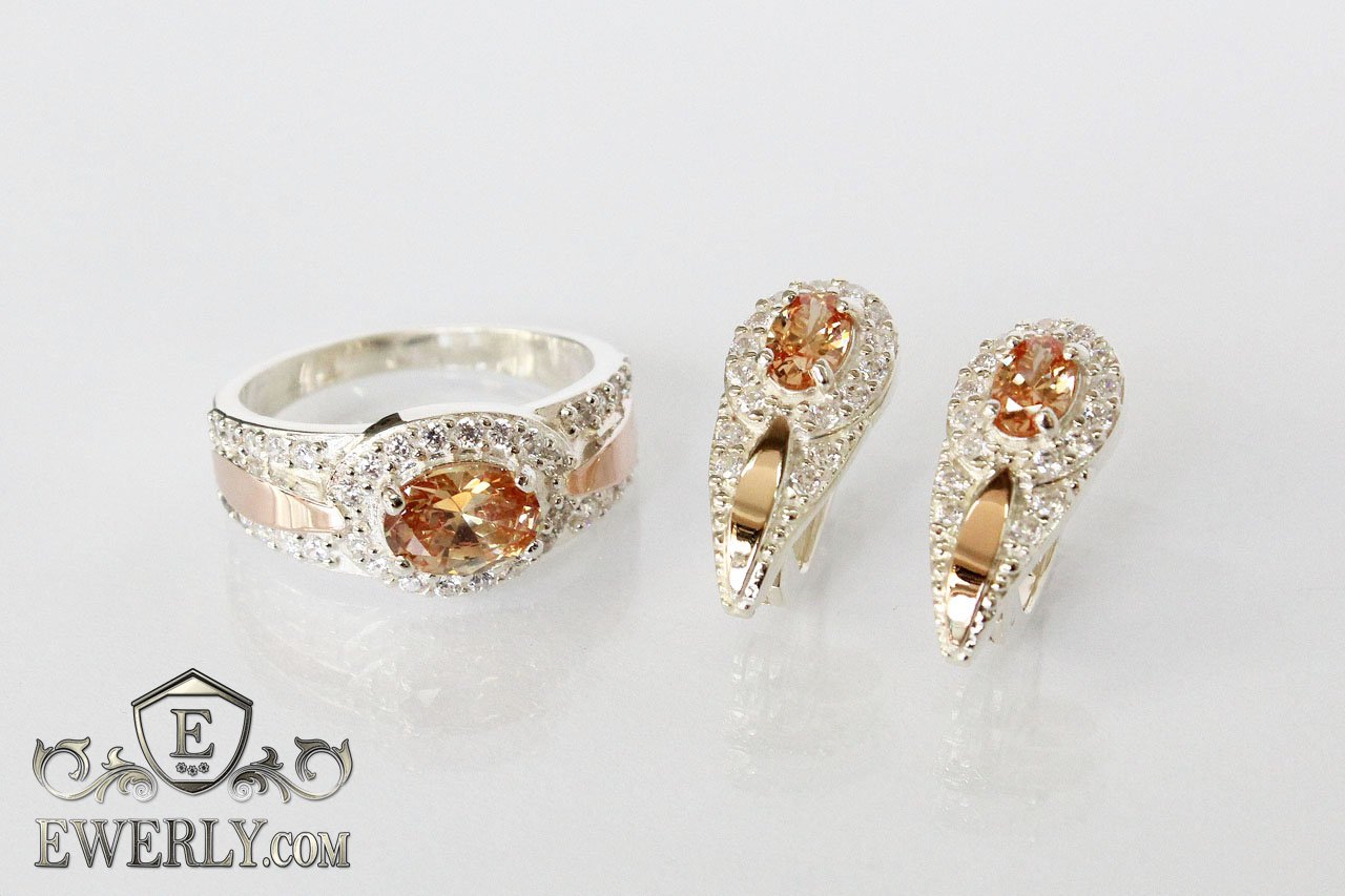 Женские серебряные серёжки и кольцо с золотом и камнями (цвет-шампань)