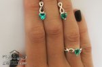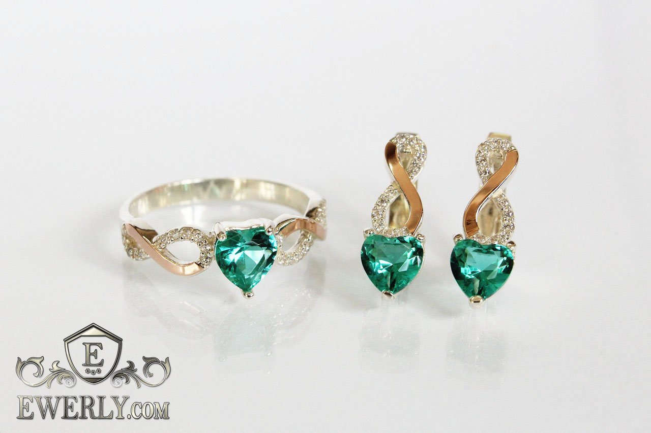 Набор из серебряных серёжек и кольца с сердцем (камень зелёного цвета)