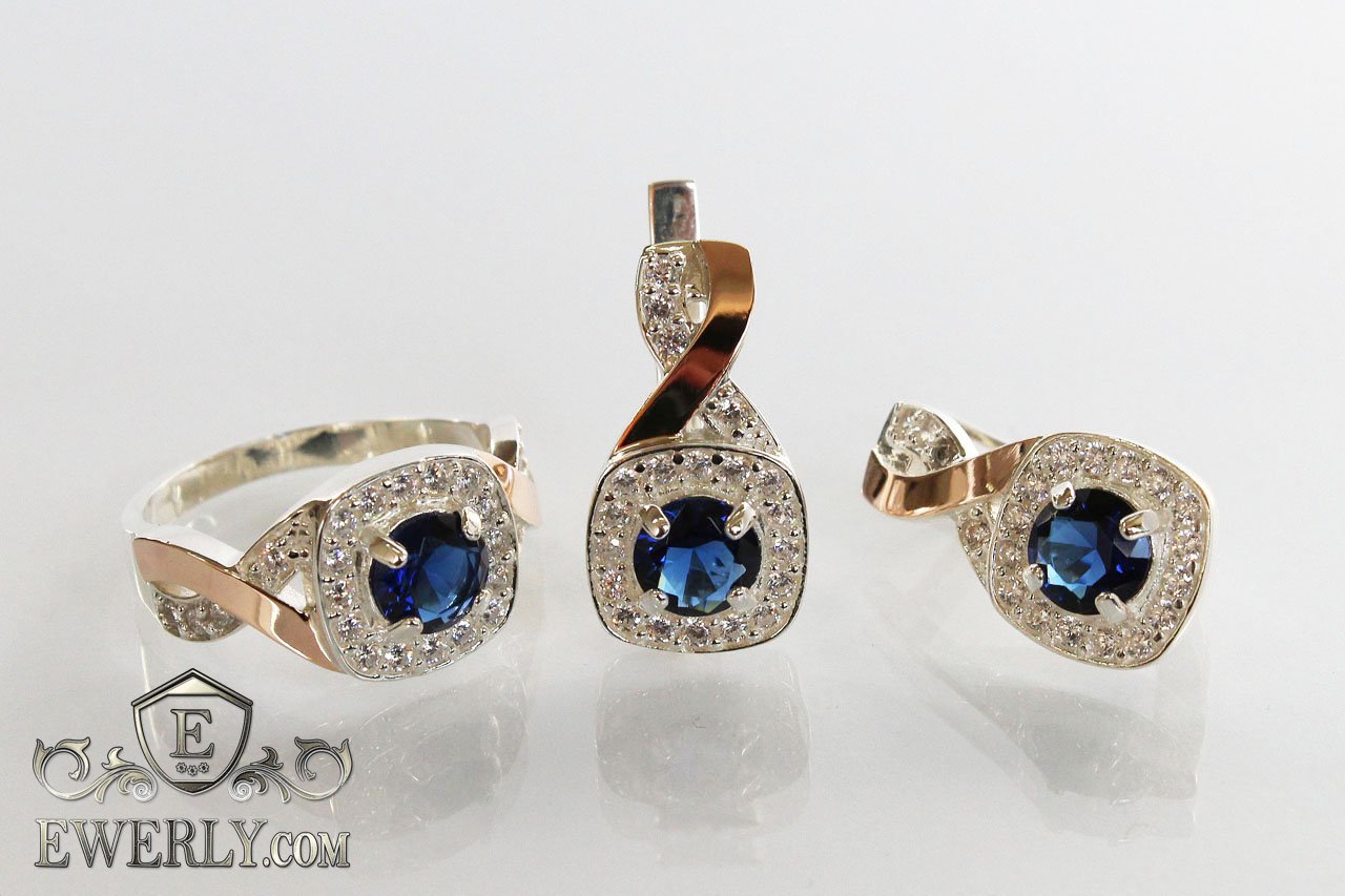 Серебряные серьги и кольцо с золотыми вставками и синими камнями