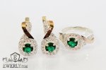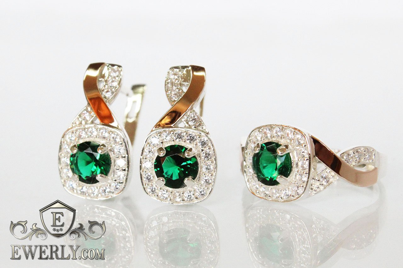 Серебряные серёжки и кольцо из серебра 925 пробы с золотыми вставками 375 пробы и камнями - зелёными фианитами для девушки.