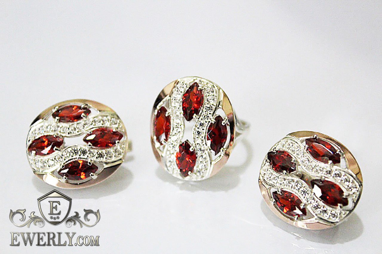 Женский комплект: серёжки и кольцо из серебра 925 пробы с золотом 375 пробы и красными камнями - фианитами (цвет-гранат).