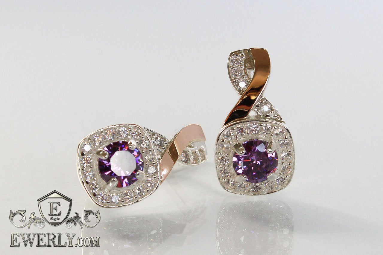 Женские серебряные серёжки с камнями (цвет - аметист)