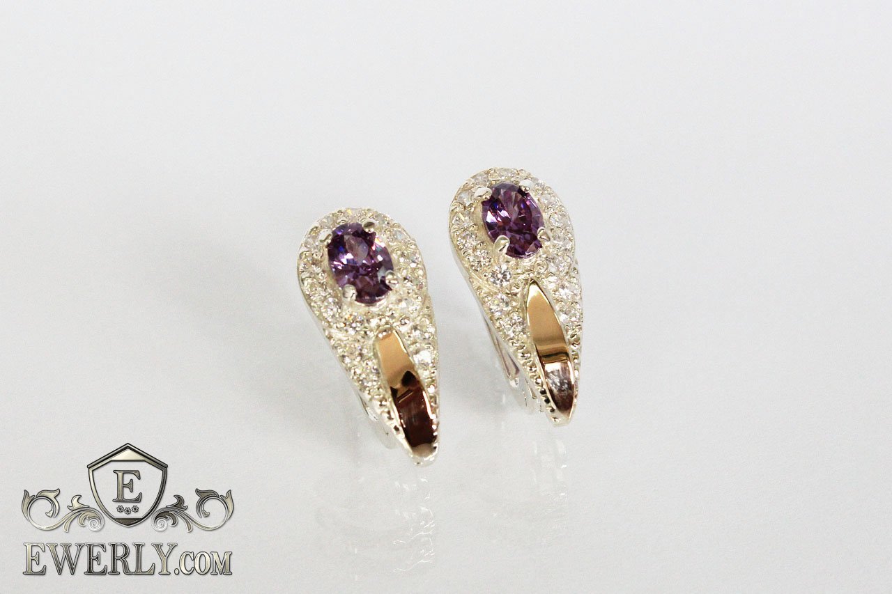 Серебряные серьги - капли с золотом и камнями (цвет аметиста)
