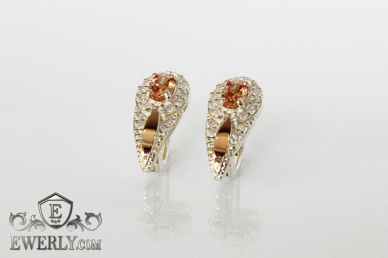 Серебряные серьги - капли с золотом и камнями (цвет шампань)