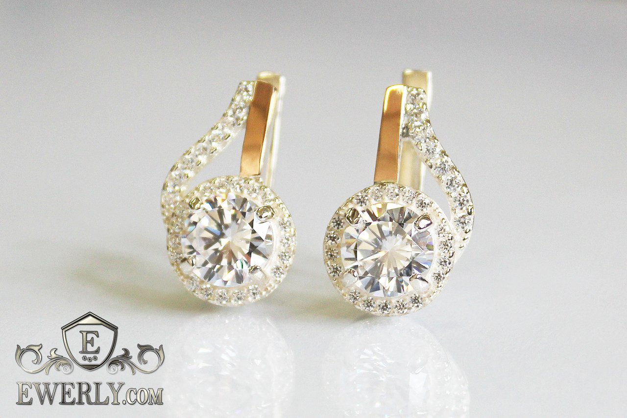Женские серебряные серьги 925 пробы с золотыми пластинами 375 пробы с белыми фианитами.