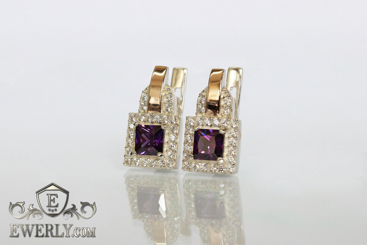 Серебряные серьги с золотыми вставками и фианитами (цвет-аметист)