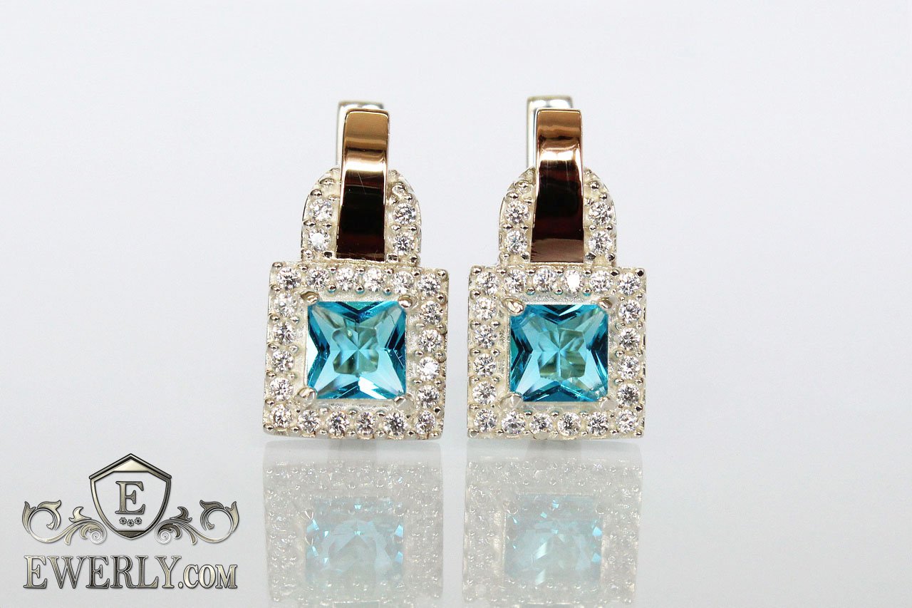 Серебряные серьги с золотыми вставками и светло-голубыми фианитами