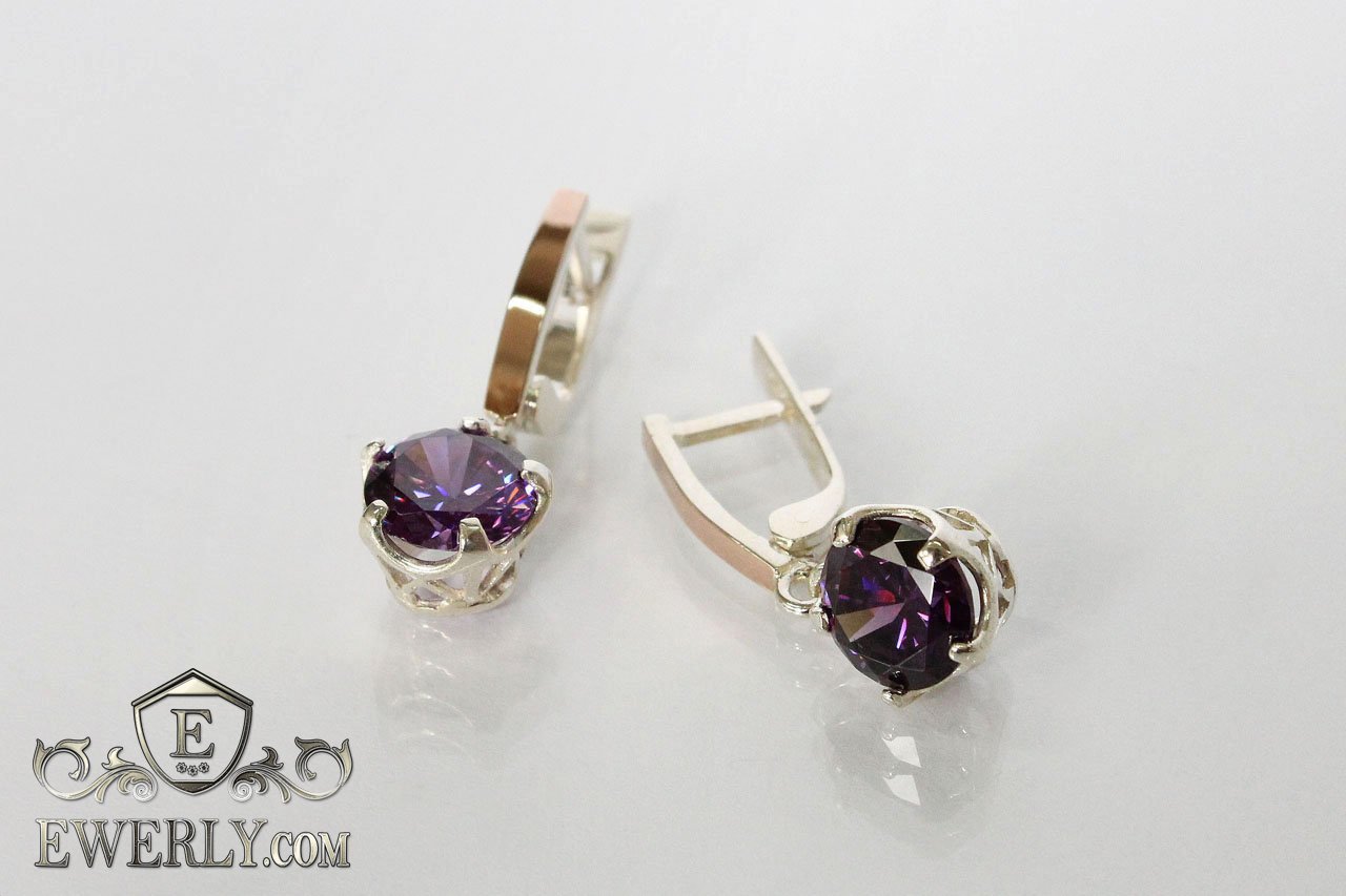 Серёжки из серебра 925 пробы для девушки с золотыми вставками 375 пробы и камнями - фианитами аметистового цвета.