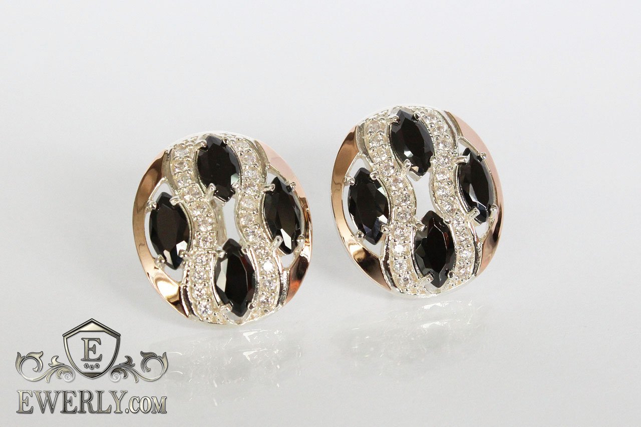 Серёжки из серебра с золотом для женщин (серебро 925 пробы, золото 375 пробы) с камнями - фианитами чёрного цвета.