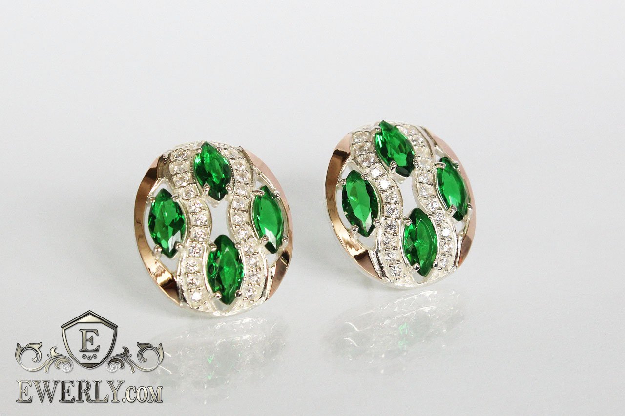 Серёжки из серебра с золотом для женщин (серебро 925 пробы, золото 375 пробы) с камнями - фианитами зелёного цвета.