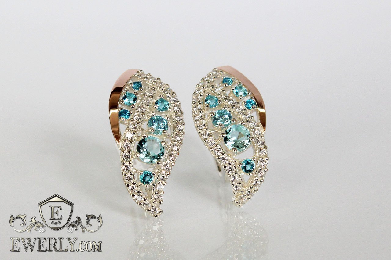 Женские серьги из серебра с золотом и светло-голубыми камнями