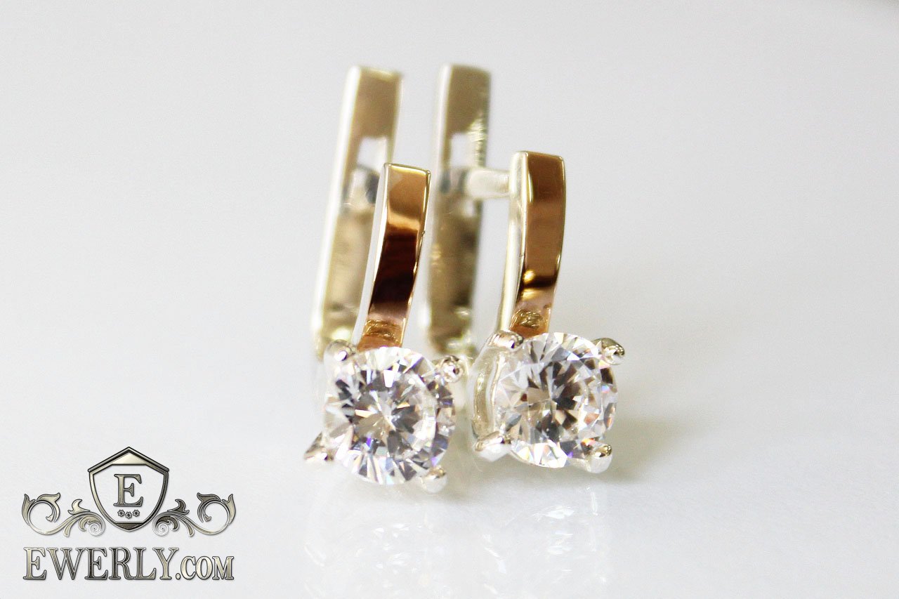 Серьги из серебра 925 пробы с золотом и фианитами (белый цвет)