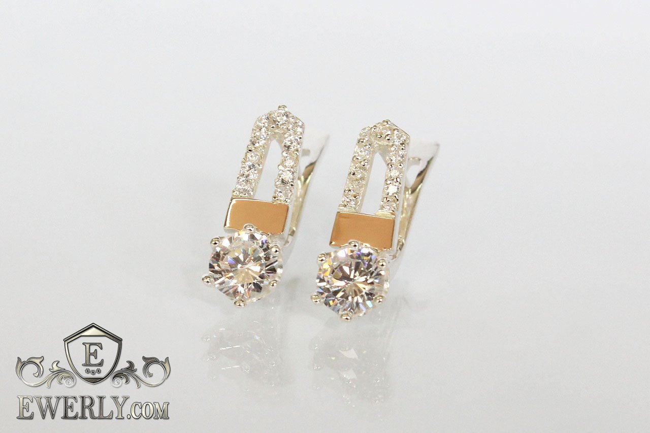 Серьги из серебра 925 пробы с золотыми пластинами 375 пробы с белыми фианитами для женщин.