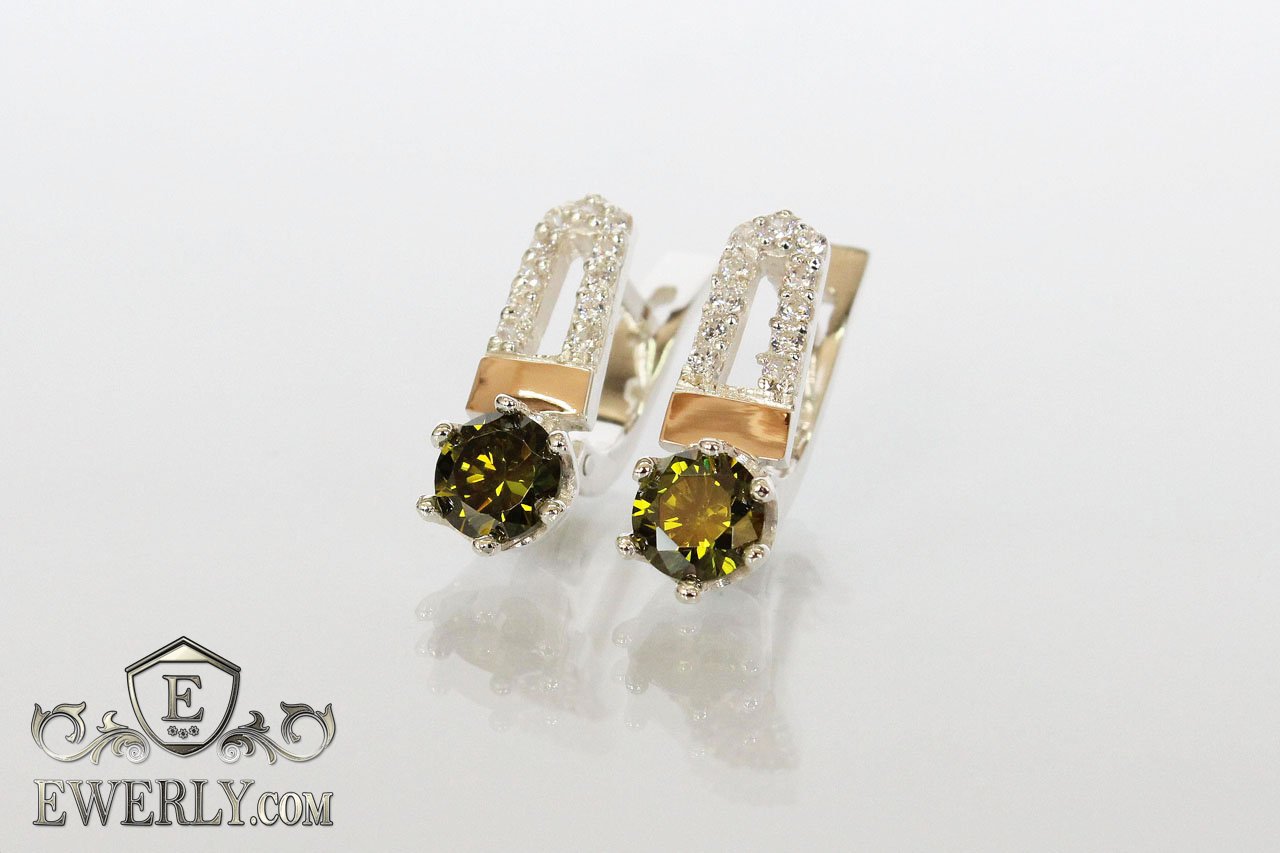 Серьги из серебра 925 пробы с золотыми пластинами 375 пробы с фианитами (цвет - олива) для женщин.