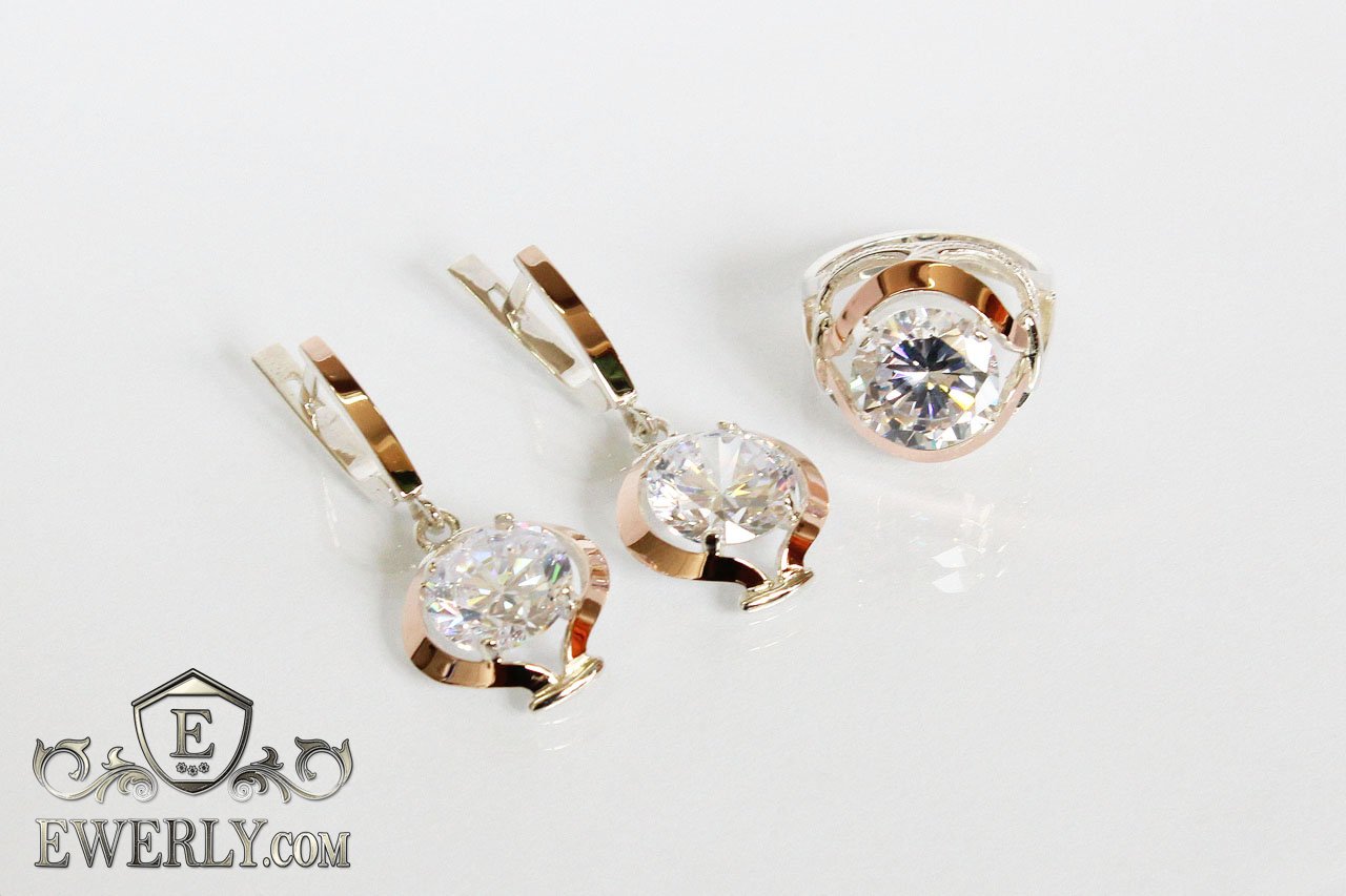 Комплект из женского кольца и серёжек из серебра 925 пробы с золотыми пластинами 375 пробы.