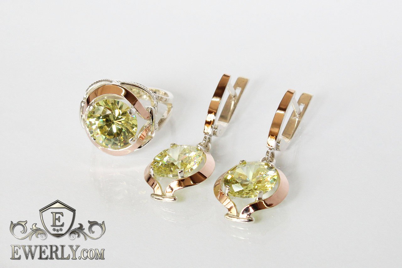 Женский комплект: серебряное кольцо и серёжки с жёлтыми камнями