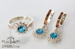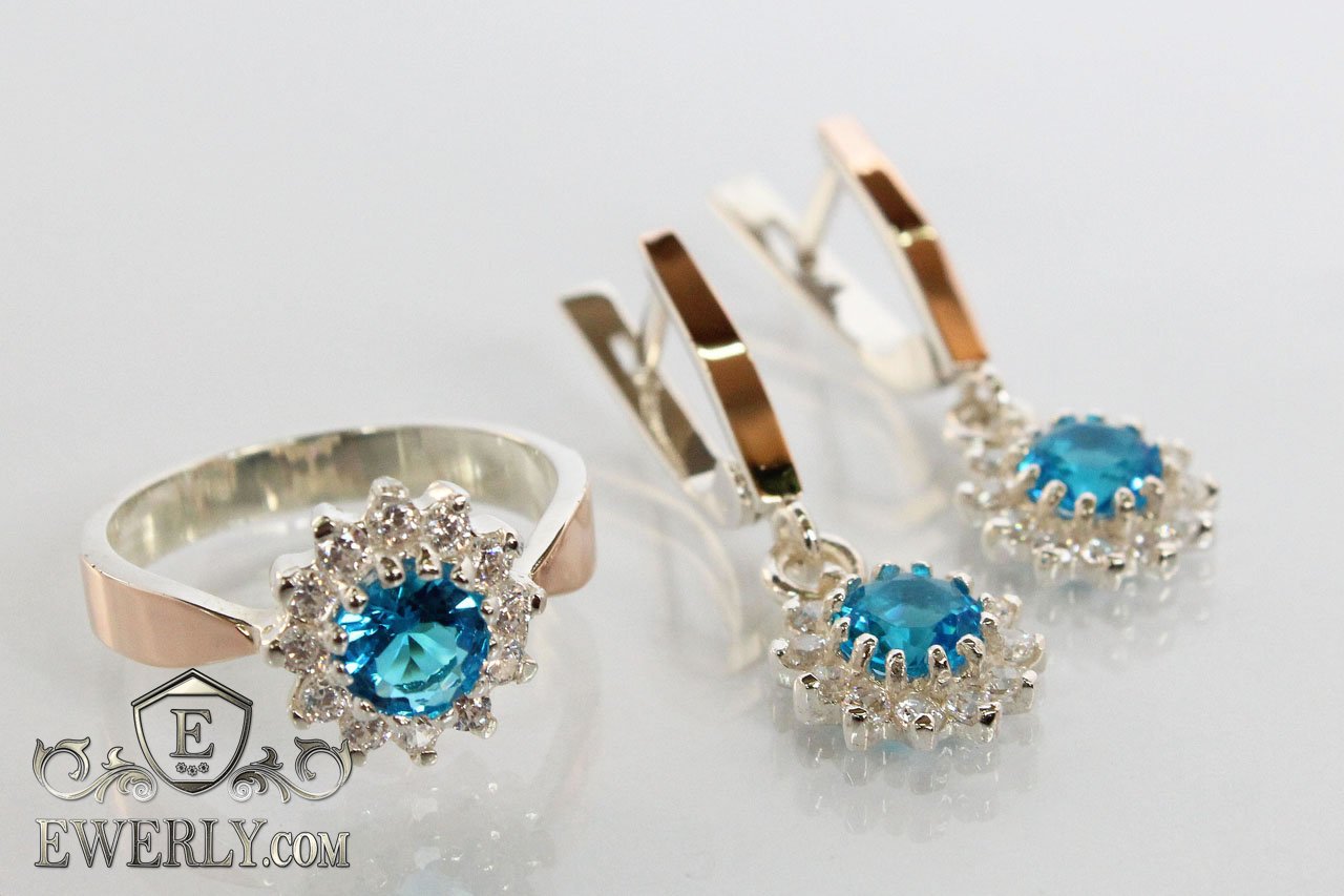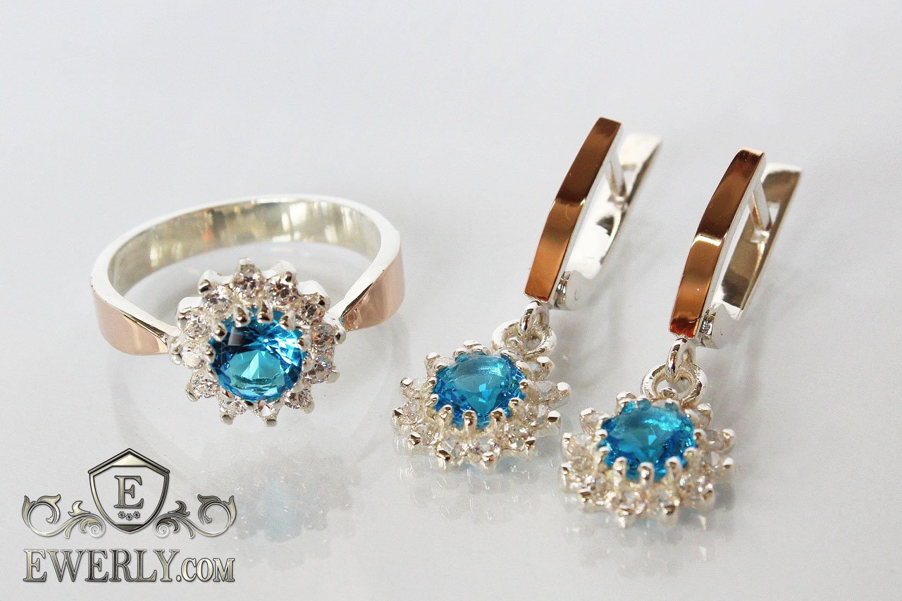 Женский комплект: серебряное кольцо и серёжки с голубыми фианитами