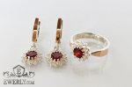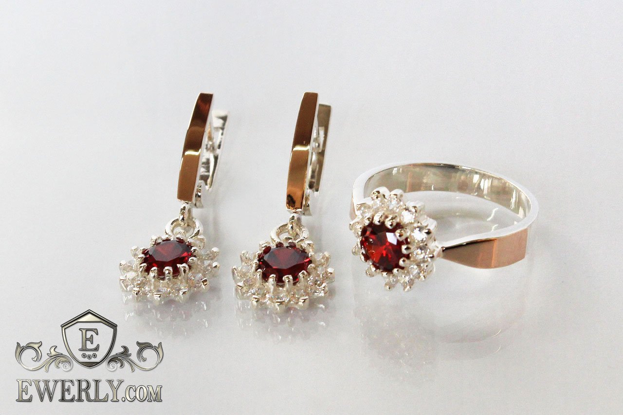 Женский комплект: серебряное кольцо и серёжки с красными камнями