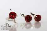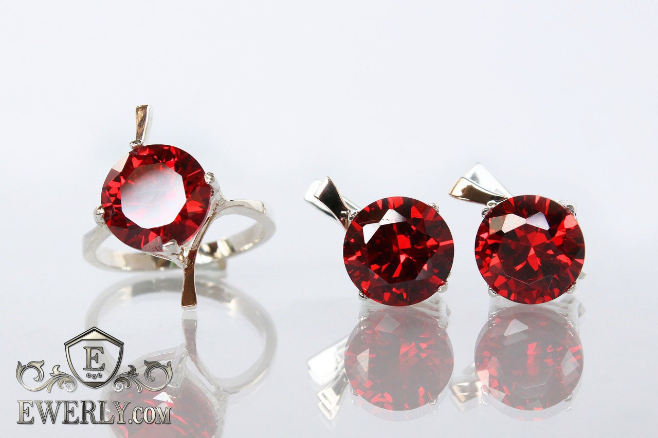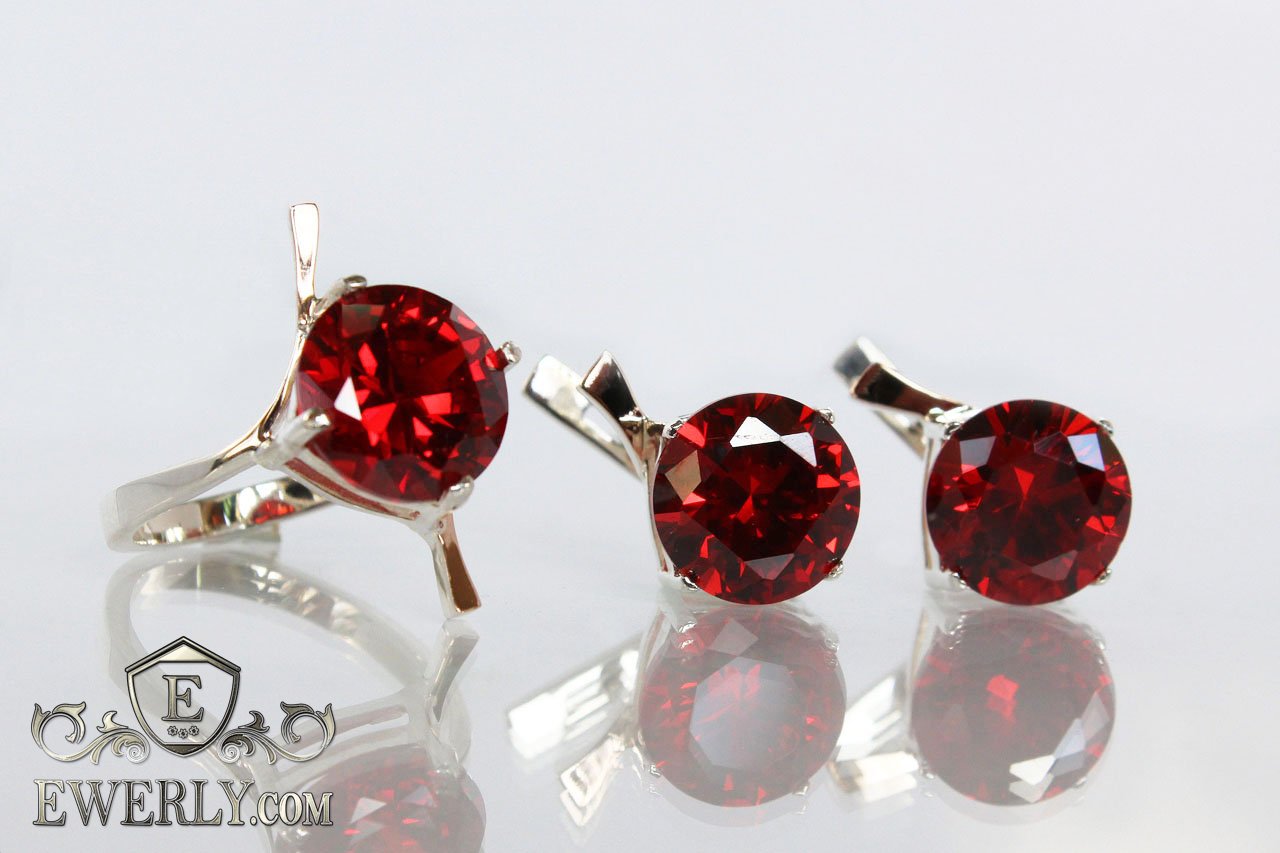 Женский набор: серебряное кольцо и серёжки с красными камнями