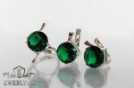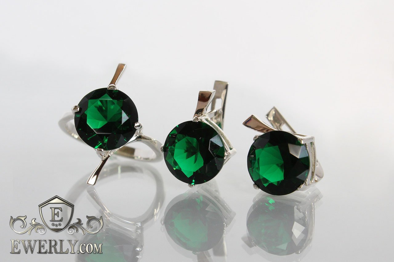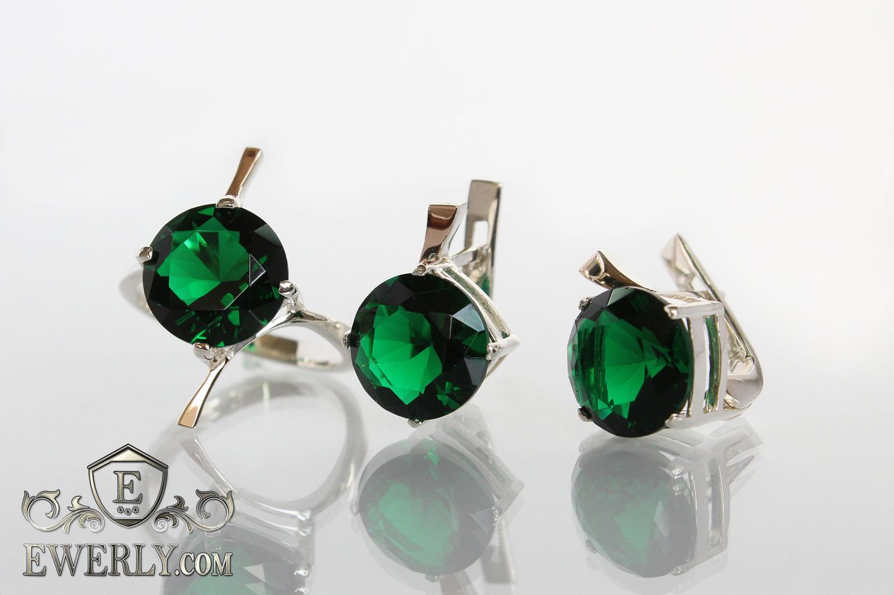 Женский набор: серебряное кольцо и серёжки с зелёными камнями