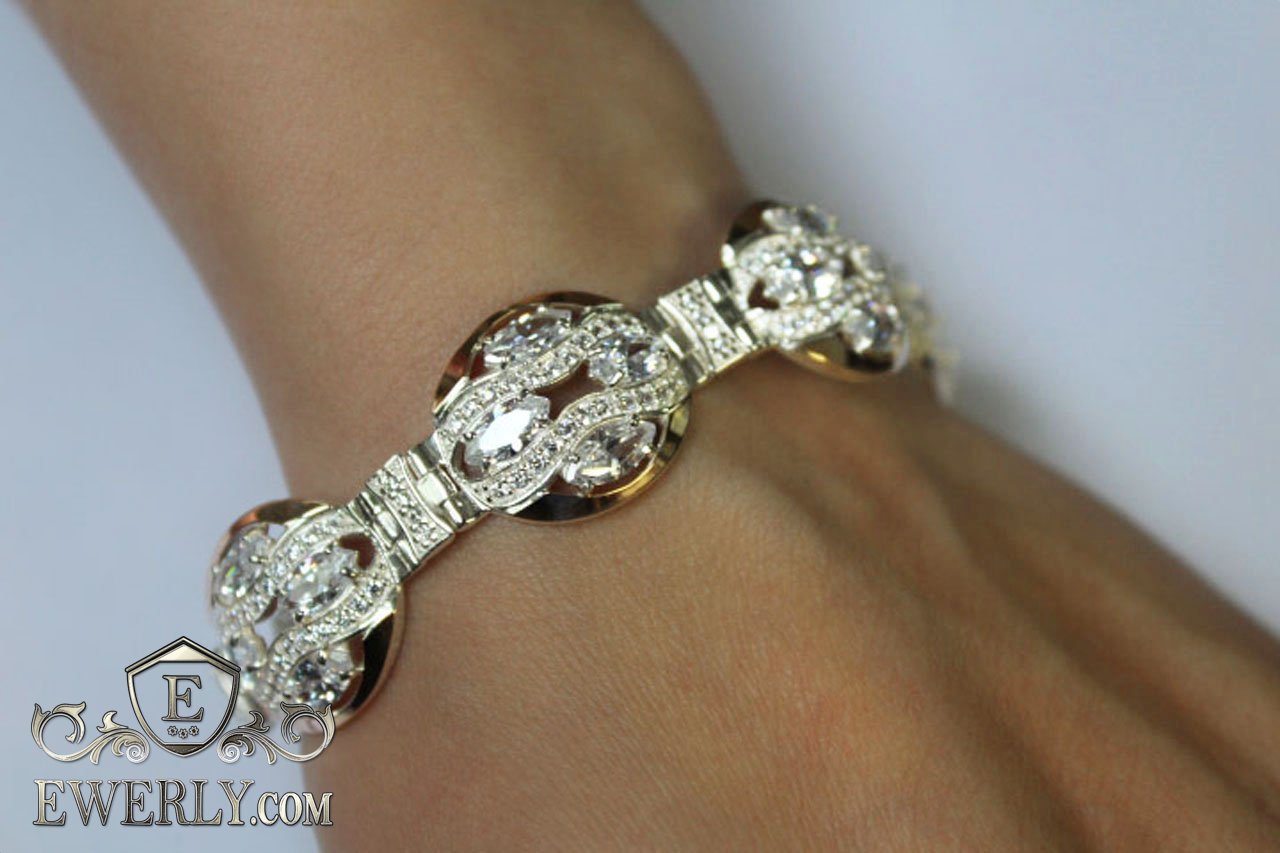 Женский браслет из серебра с белыми фианитами и вставками золота