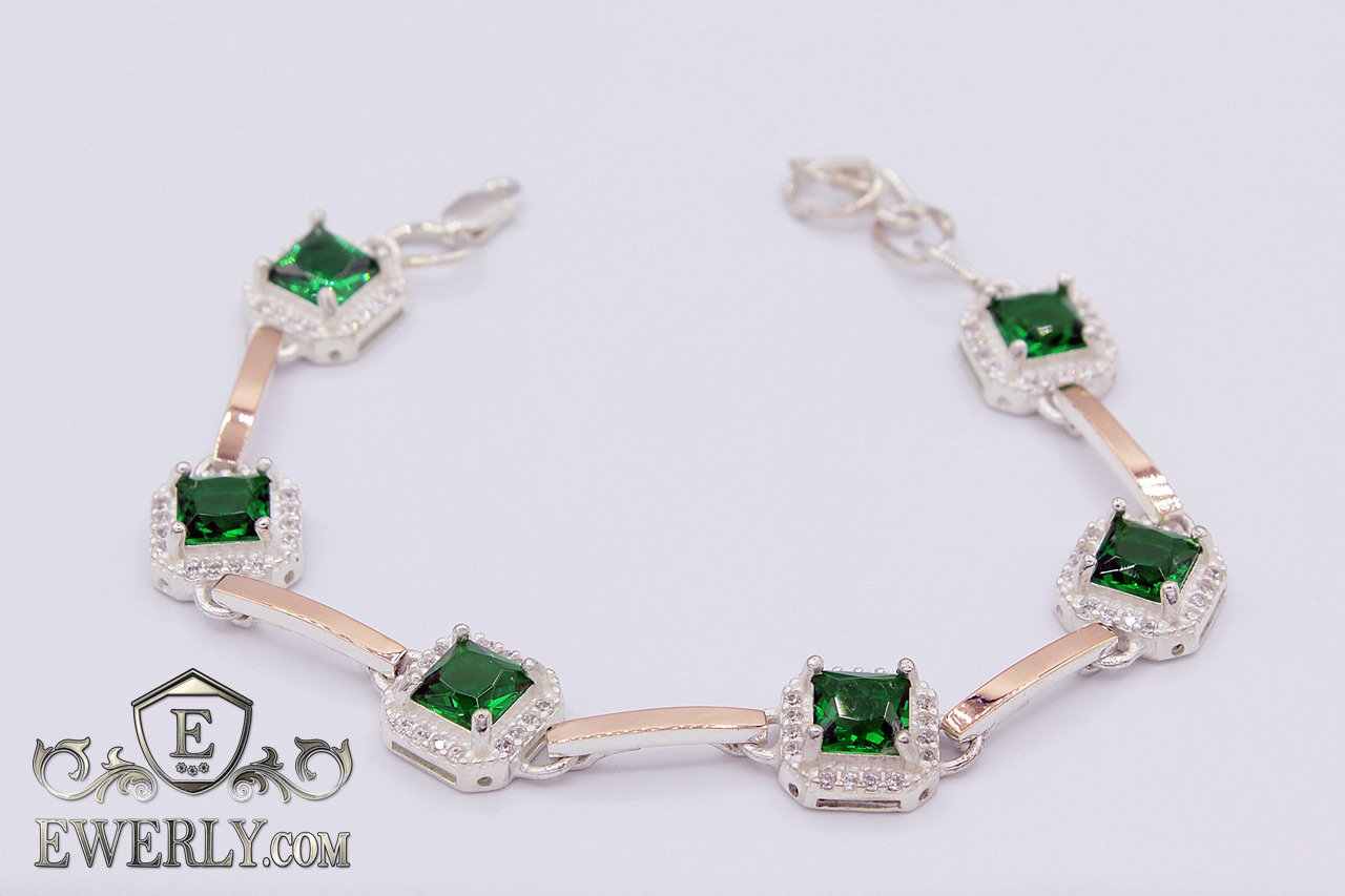 Женский серебряный браслет с золотом и зелёными камнями