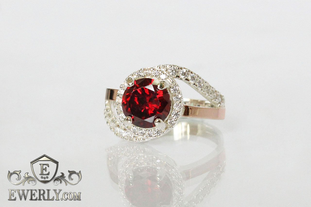 Женское кольцо из серебра 925 пробы с золотыми пластинами 375 пробы с красным камнем (фианит гранатового цвета).