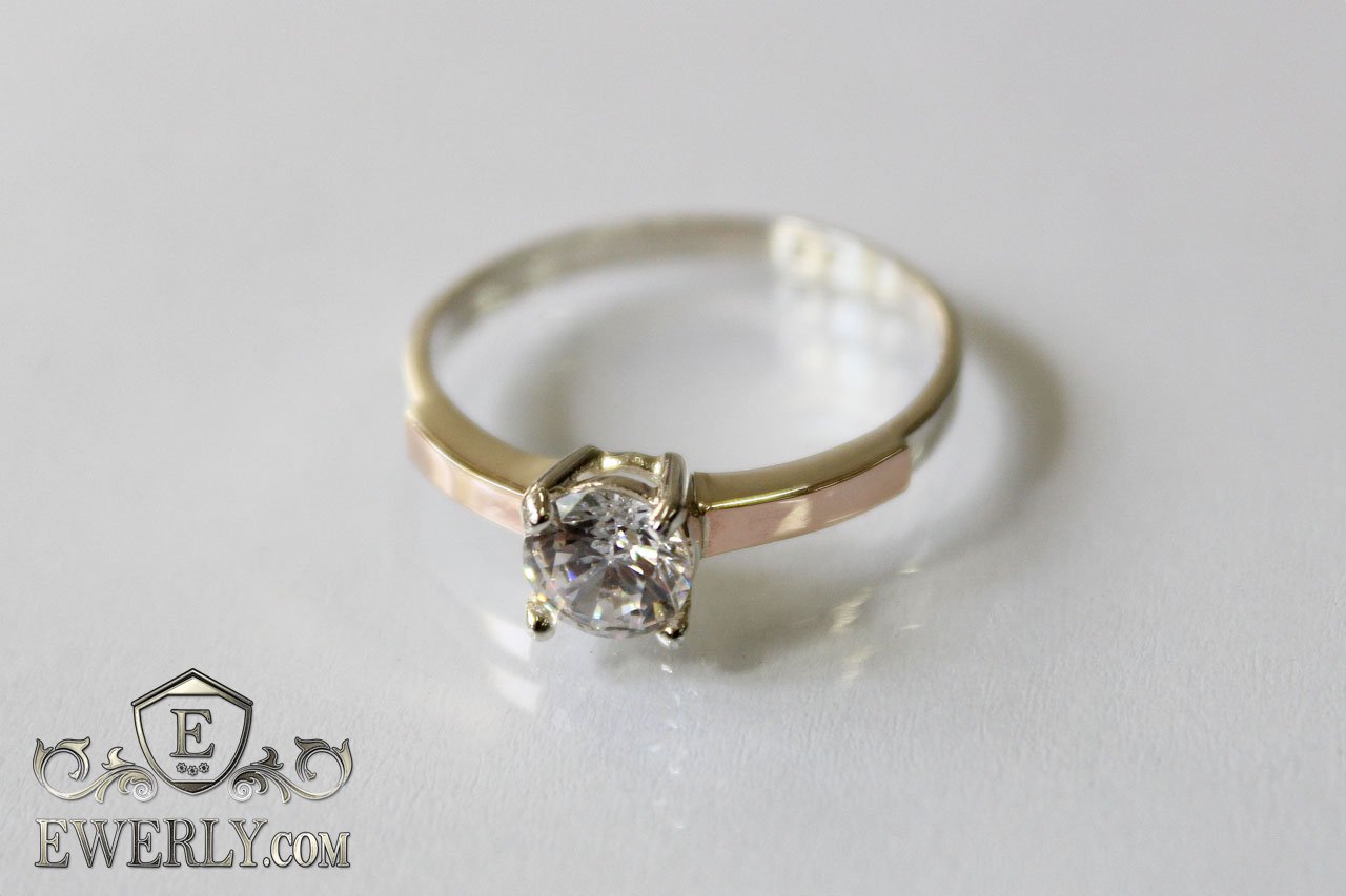 Женское серебряное кольцо 925 пробы с золотыми пластинами 375 пробы с фианитом (белый цвет).