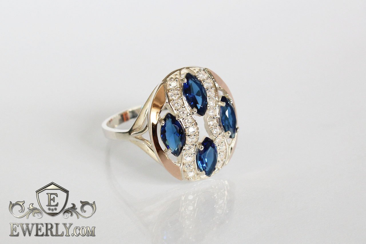 Женское серебряное кольцо 925 пробы с золотыми пластинами 375 пробы с синими фианитами.