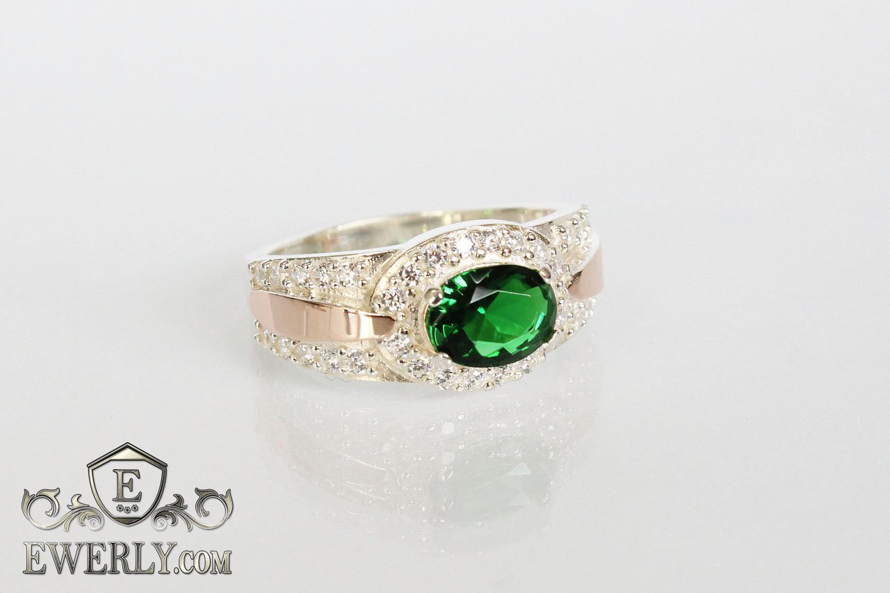 Женское серебряное кольцо 925 пробы с золотыми пластинами 375 пробы с овальным зелёным камнем.