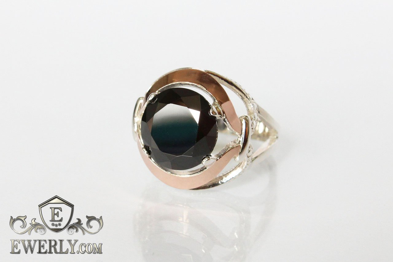 Кольцо из серебра 925 пробы с золотом 375 пробы и фианитом чёрного цвета для женщин.