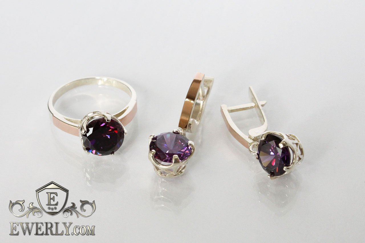 Серебряное кольцо и серьги с камнями (цвет-аметист) для женщин