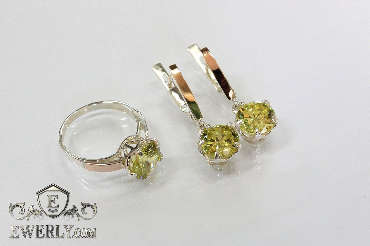 Серебряное кольцо и серьги с камнями (цвет-шампань) для женщин