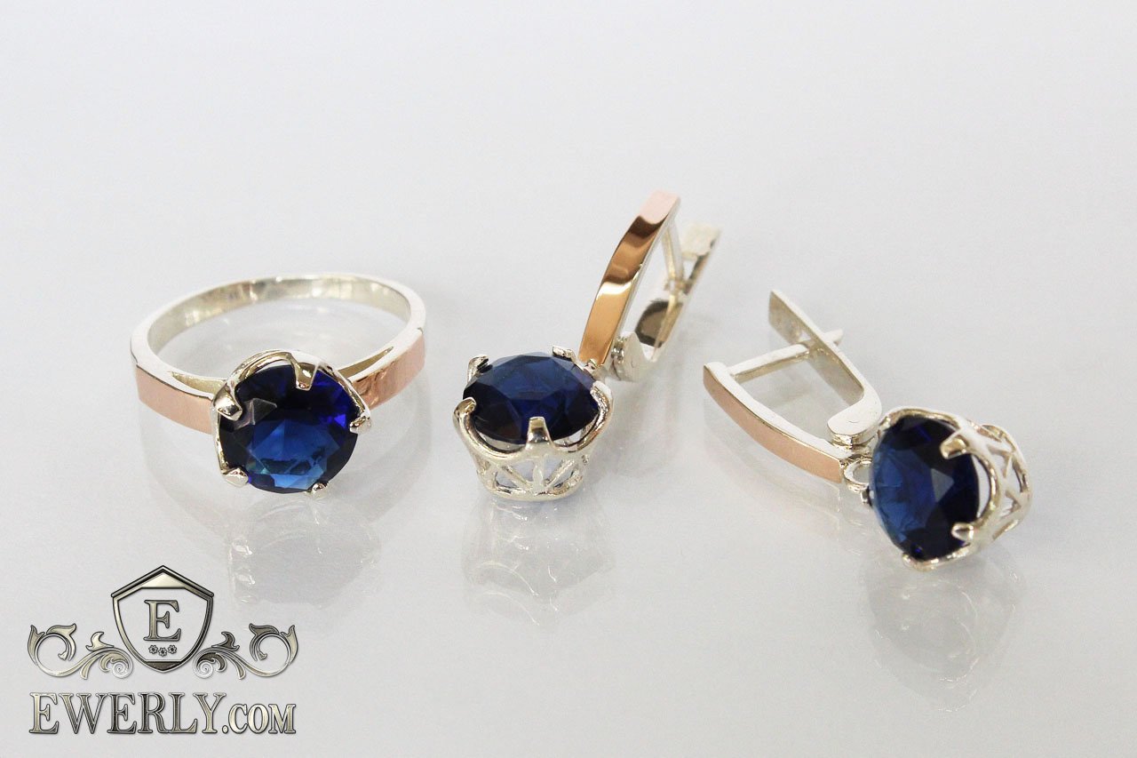 Набор из женского серебряного кольца и серебряных серёжек 925 пробы с золотыми пластинами 375 пробы.