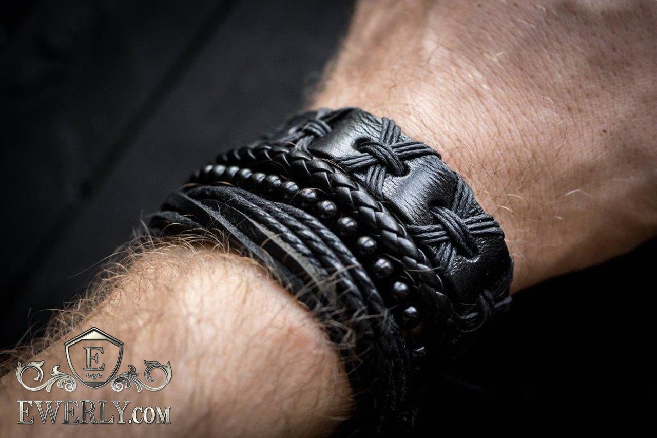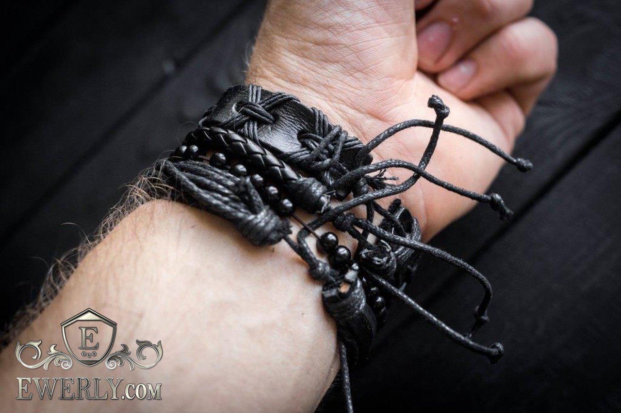 - Три кожаных браслета с регулировкой на шнурке и один браслет-бусины.