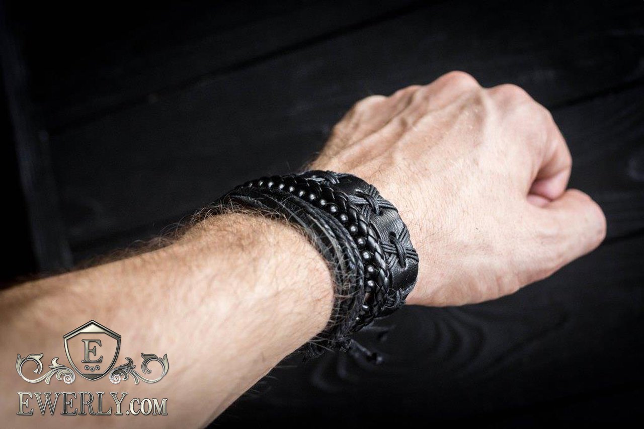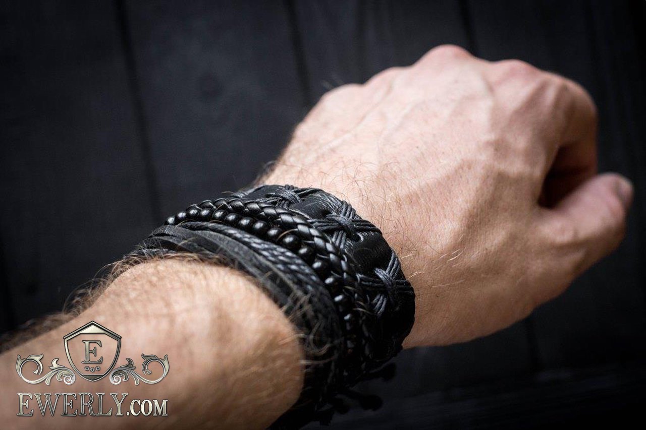 Комплект мужских браслетов из кожи (чёрный) 124013DX