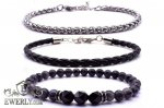 Комплект состоит из трёх мужских браслетов: из камня (вулканическая лава), кожи и стали.