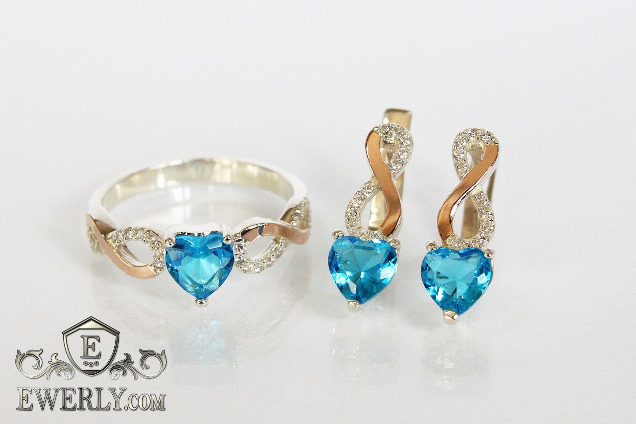 Набор из серебряных серёжек и кольца с сердцем (камень голубого цвета)
