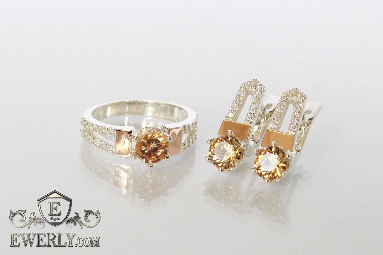 Женские серебряные серьги и кольцом с золотом и камнями цвета-шампань