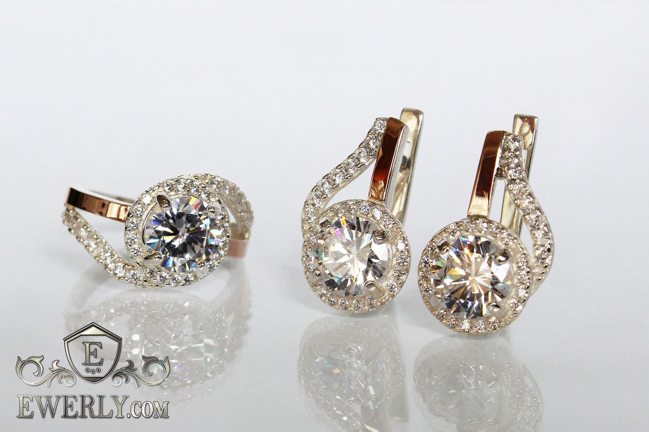 Женские серебряные кольцо и серёжки с золотом и с белыми камнями