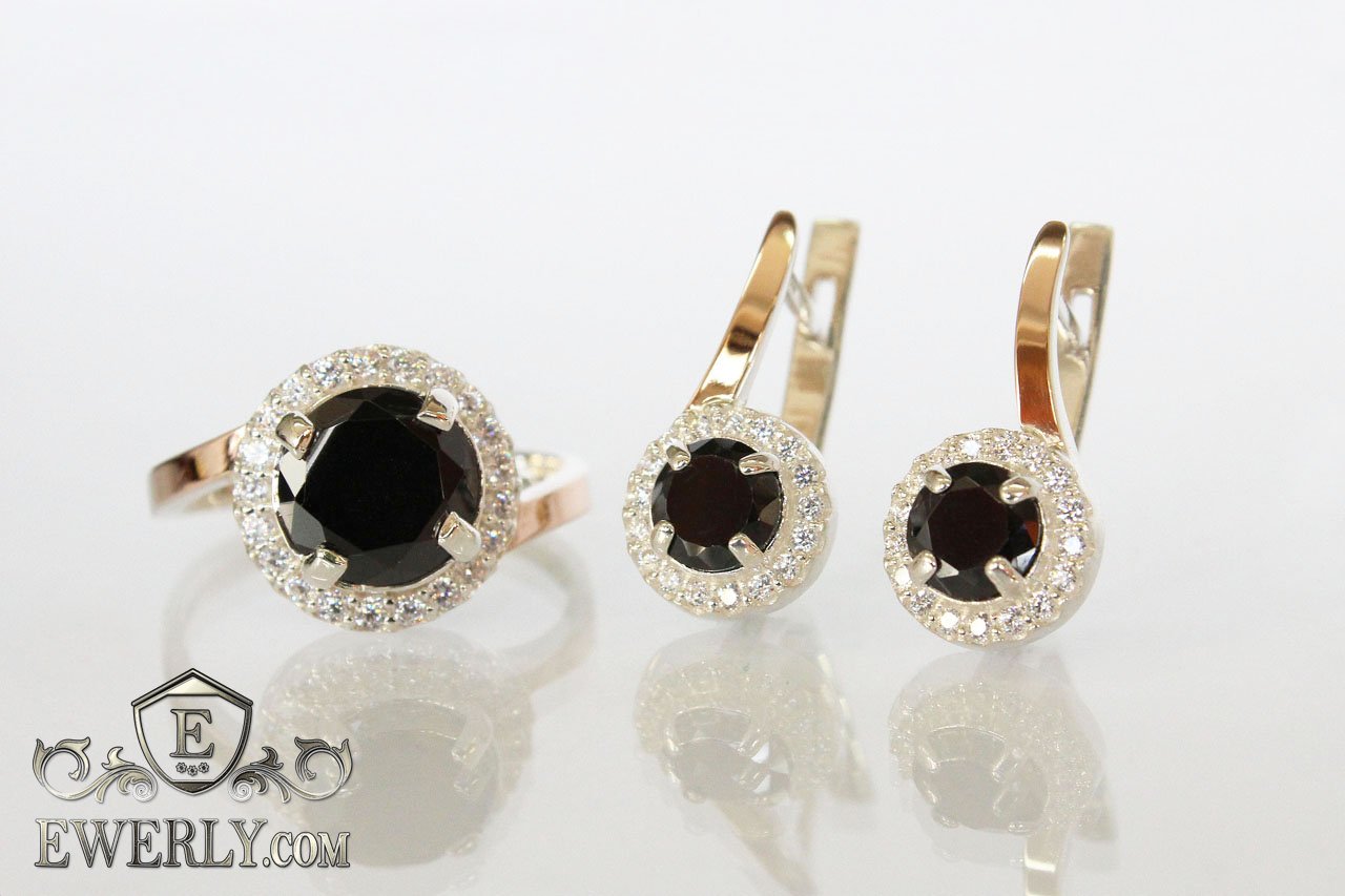 Женские серебряные кольцо и серьги с золотом и чёрными камнями