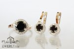 Женские серебряное кольцо и серьги с золотыми вставками и камнями - чёрными фианитами.