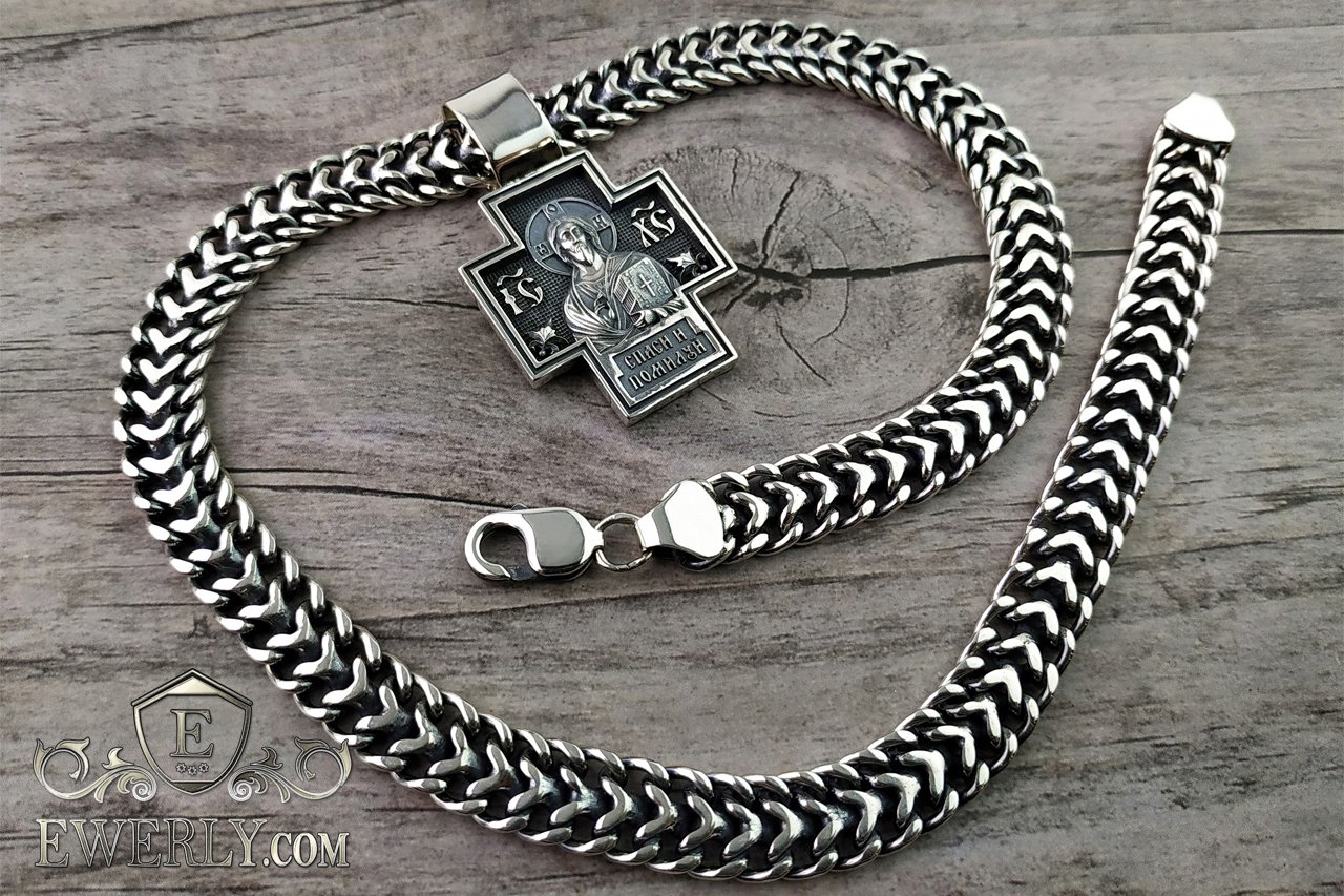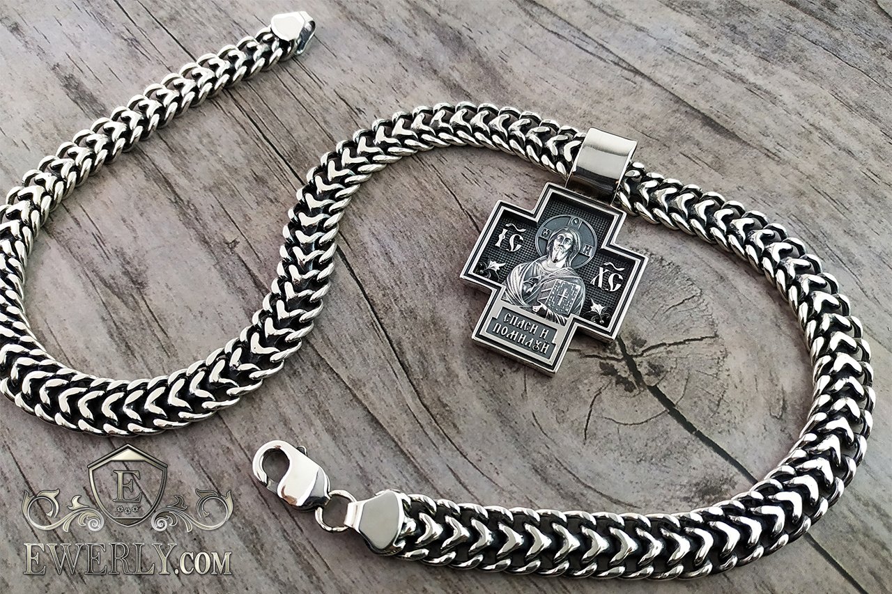 Мужская серебряная цепь с крестом нательным православным