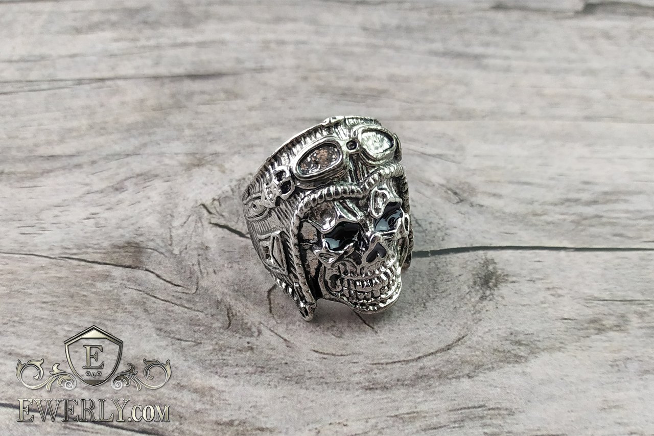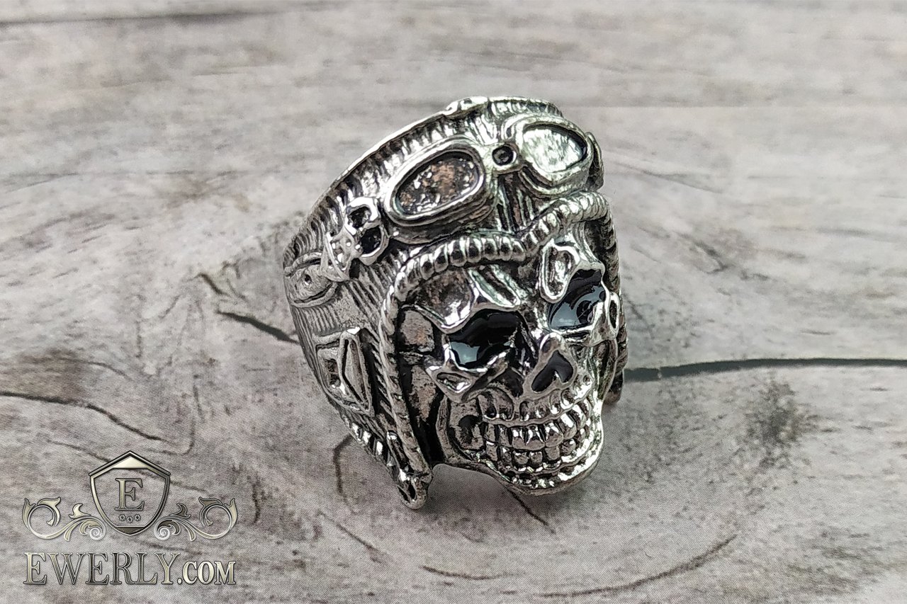 На фото изображён серебряный перстень мужской - череп из серебра 925 пробы с нанесённой чёрной эмалью.