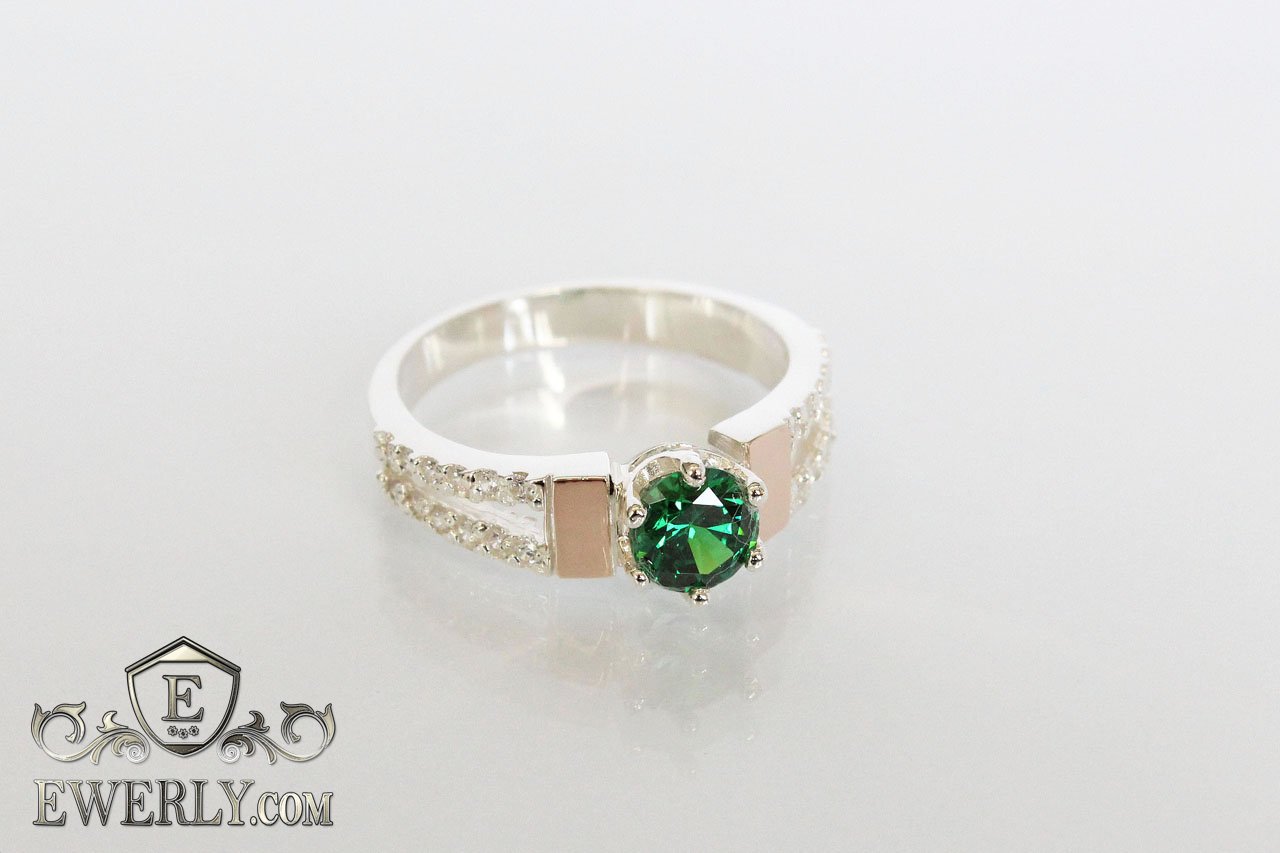 Женское Серебряное кольцо 925 пробы с золотыми вставками 375 пробы с зелёным камнем.